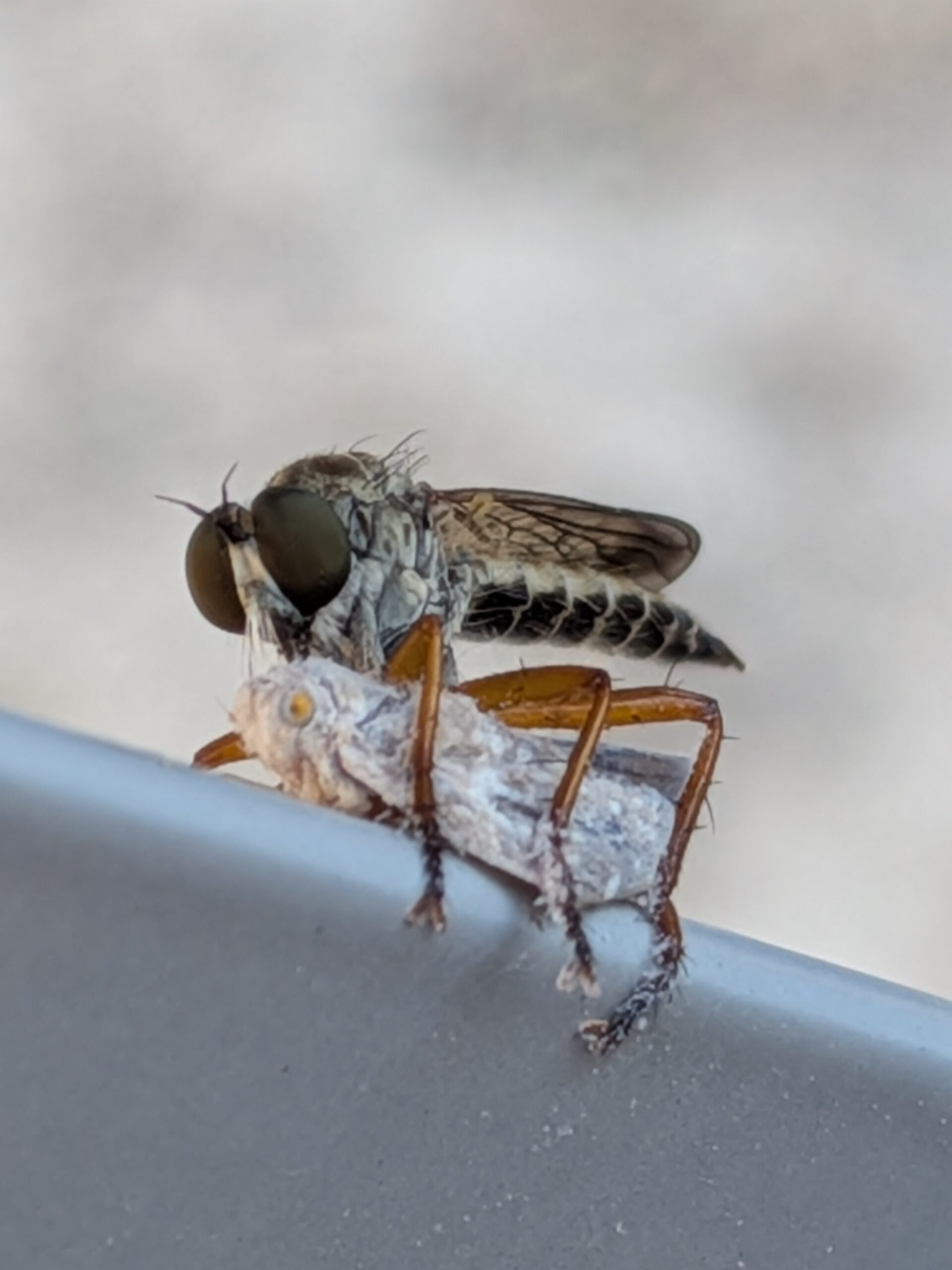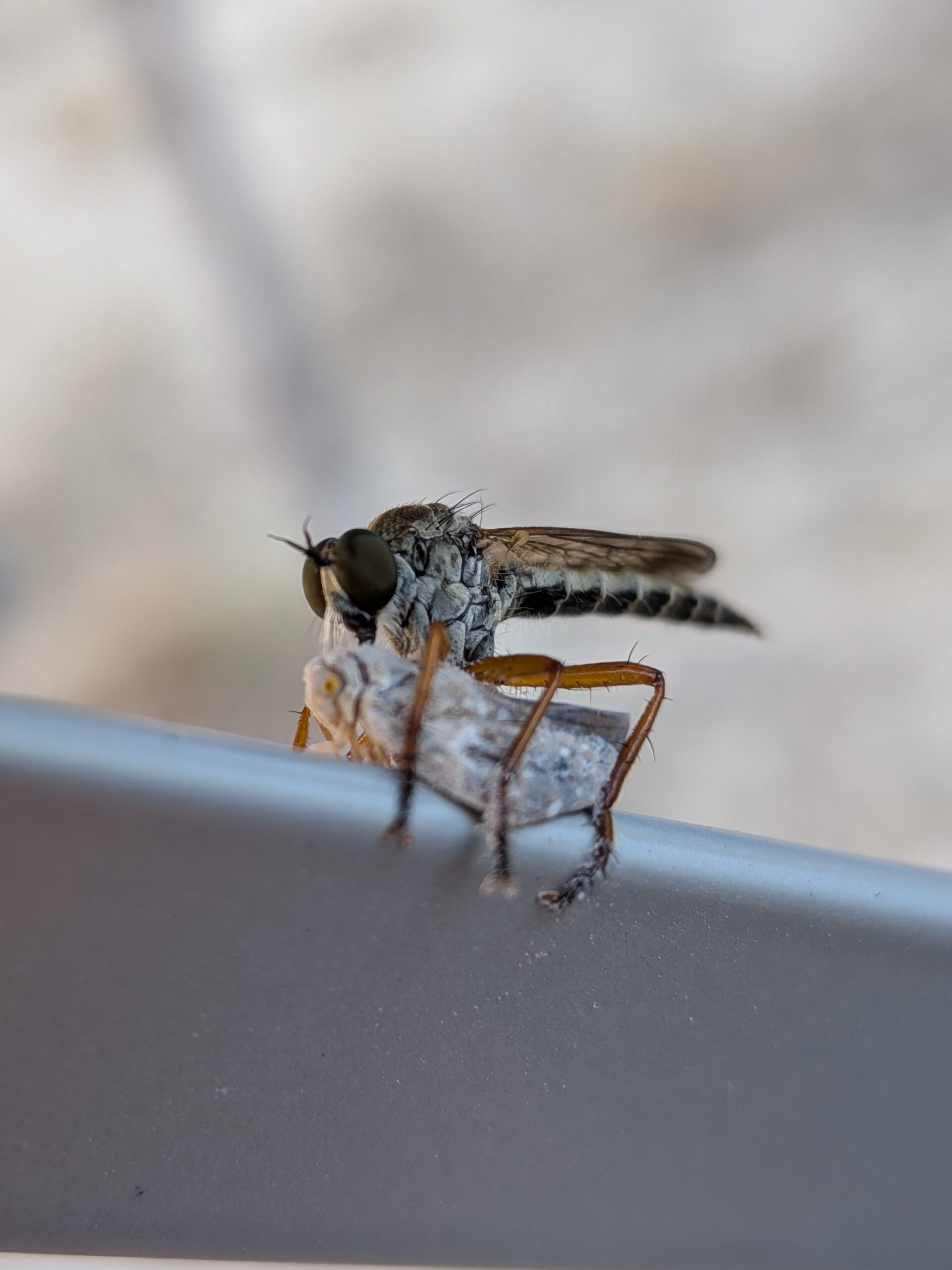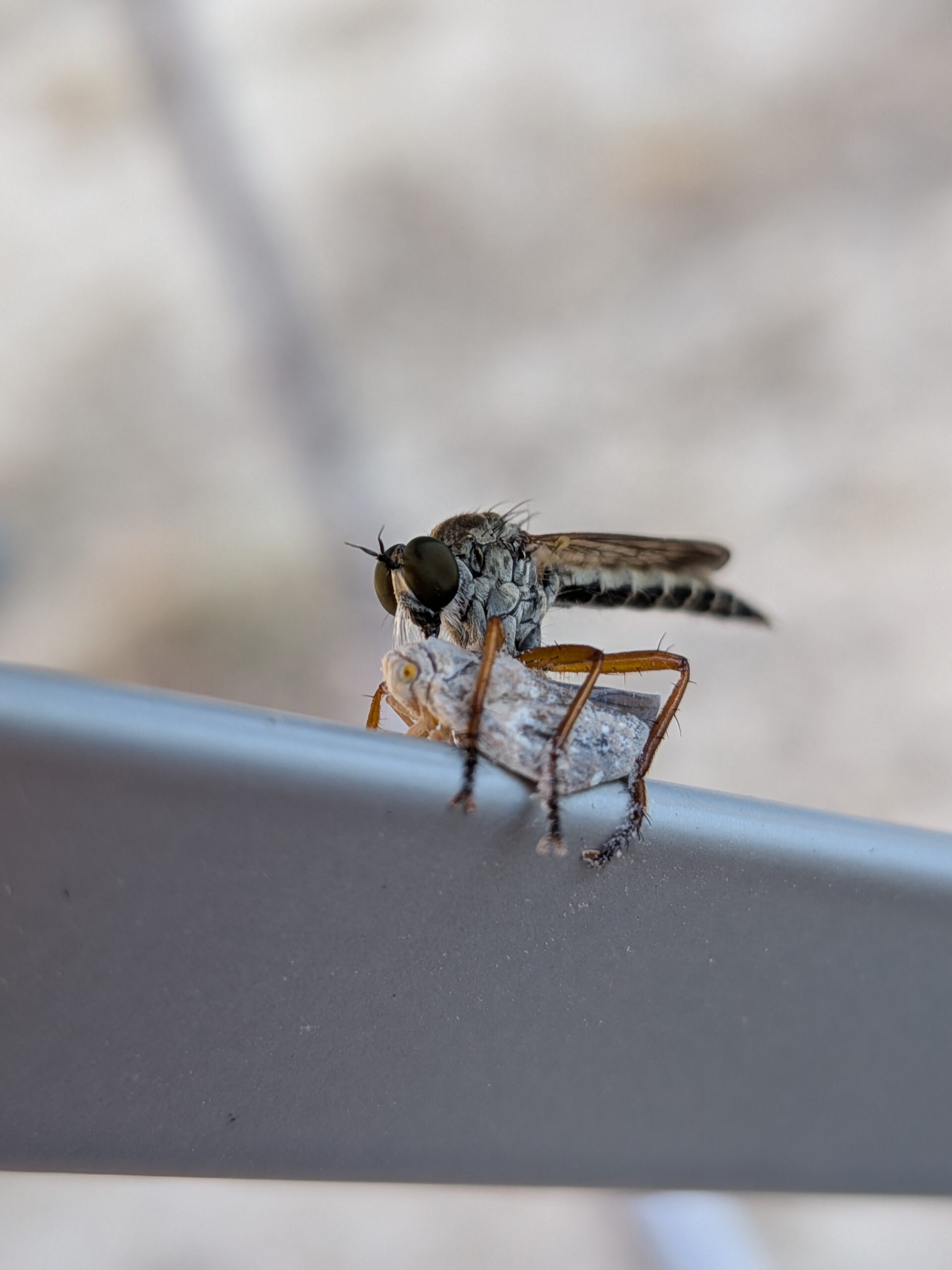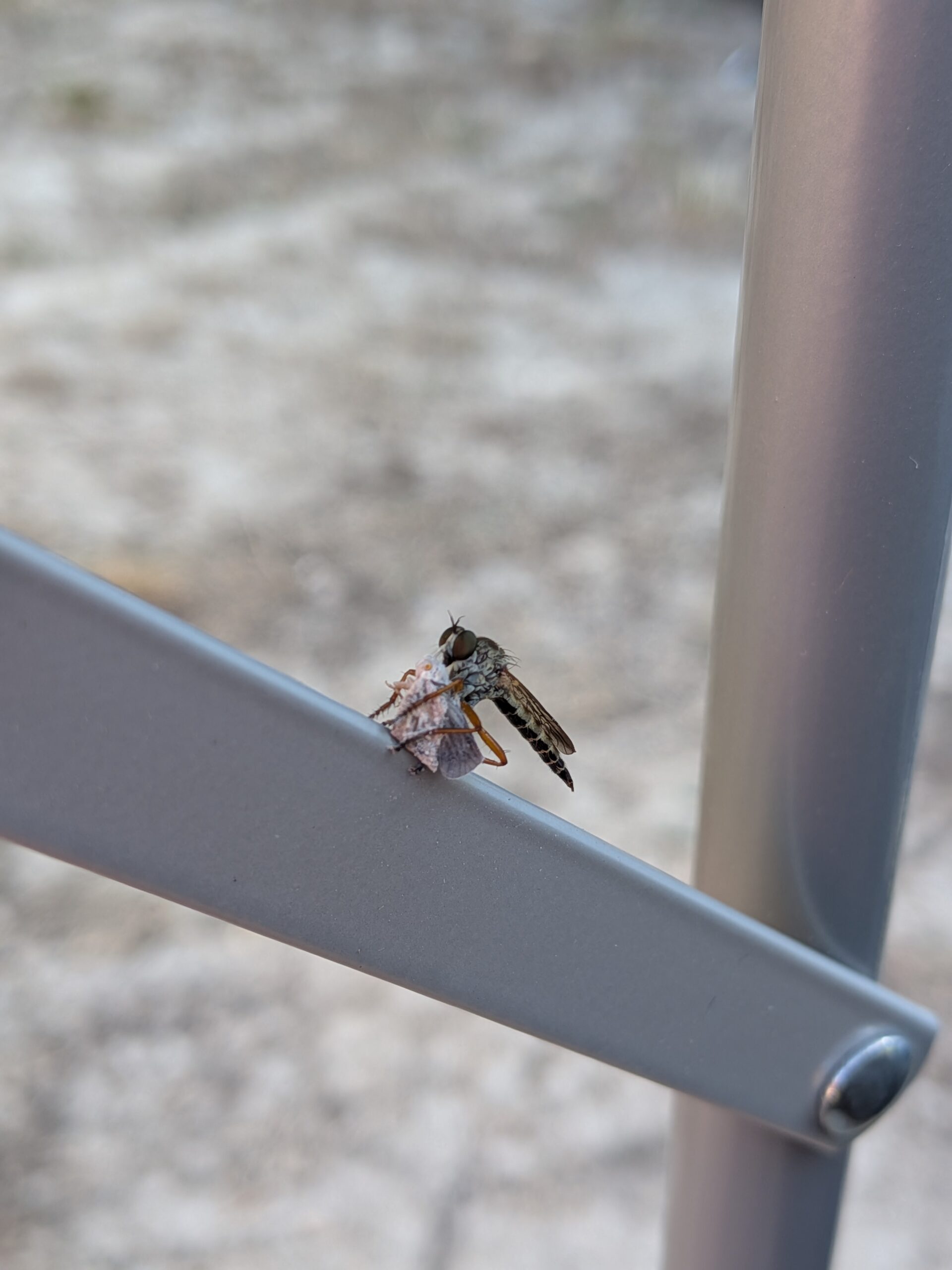 Le test se fit donc en camping, après le petit déj. Je chillais tranquille quand, soudain, je vois atterrir sur un pied de table un drôle d’assemblage d’insectes.